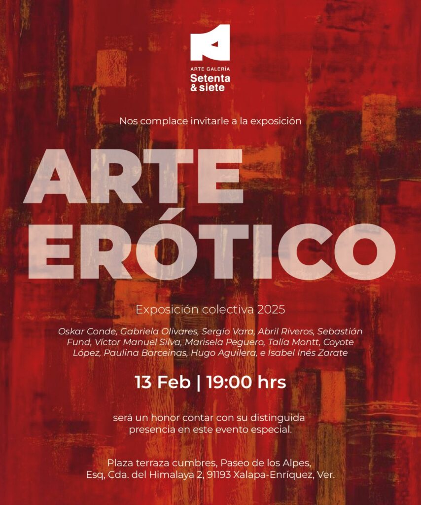 La invitación es para asistir a la inauguración el próximo jueves 13 de febrero a las 7 de la noche en la Galería 77, ubicada en Plaza Terraza Cumbres Paseo de los Alpes esquina Cda. Del Himalaya 2, en la ciudad de Xalapa, Veracruz.