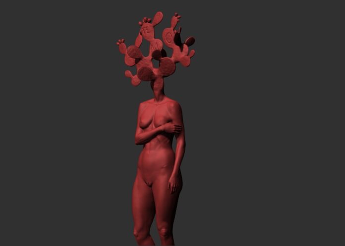 En su oportunidad, Sergio platica sobre la escultura que ha preparado, un desnudo femenino unido a una nopalera e intervenido con la frase “Te amo”.