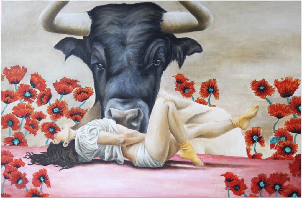 “En esta nueva serie que estoy empezando este año, pues hablo de esta unión de humanos con animales, o humanos, en este caso de esta pieza, con plantas. Entonces este desnudo, en específico, tiene una nopalera que lo refiere a esta mexicanidad, le puse a manera de cómo normalmente la naturaleza es intervenida, como a los nopales le rayan cosas. A esta nopalera le puse “Te amo”. Entonces refiriendo a esta parte de la posesión que hay en la sexualidad, con un pretexto que puede ser el amor, en ambas partes, tanto femenino como masculino”, explica.